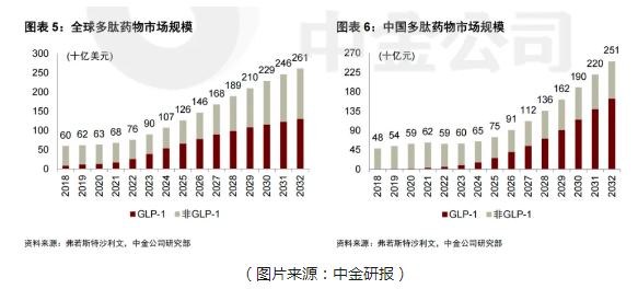整个减重市场的预期被估的很高。根据辉瑞测算,GLP-1药物2030年销售可达900亿美元。根据弗若斯特沙利文预测,2030年全球GLP-1激动剂市场规模将达到1150亿美元(从2023年到2030年的复合增长率为14.3%),多肽药物市场规模将达到2290亿美元(从2023年到2030年的符合增长率为12.6%)。