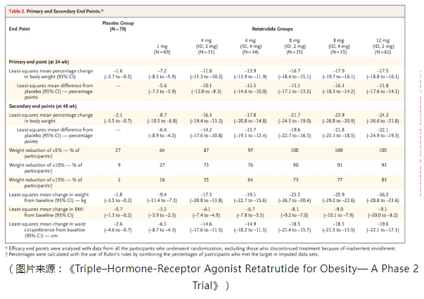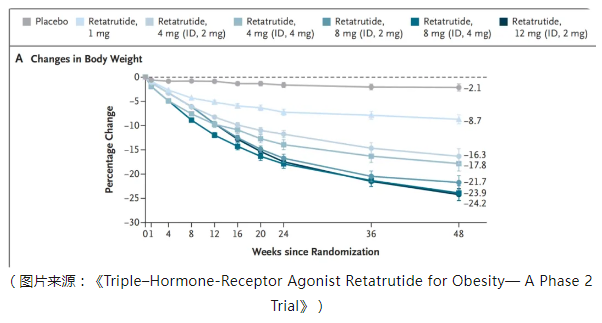 在主要临床终点上,24周时,体重百分比方面,1 mg Retatrutide组为-7.2%,4 mg组为-12.9%,8mg组为-17.3%,而12 mg的组达到了-17.5%,安慰剂组为-1.6%。此外,次要临床终点48周的体重变化上,12mg组的体重降幅达到24.2%(安慰剂组为-2.1%),8mg两个亚组也都超过了20%。