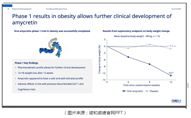 其I期临床数据在今年得到了披露,根据其I期口服版本Amycretin的数据,在平均基线89kg的16名患者中,该药实现了12周13.1%的减重。但由于时间较短,在与礼来三靶点的比较中还处于难分胜负的状态,根据礼来三靶点二期临床的曲线来看,在12周的时间段,12mg组的减重百分比也在12-13%左右。