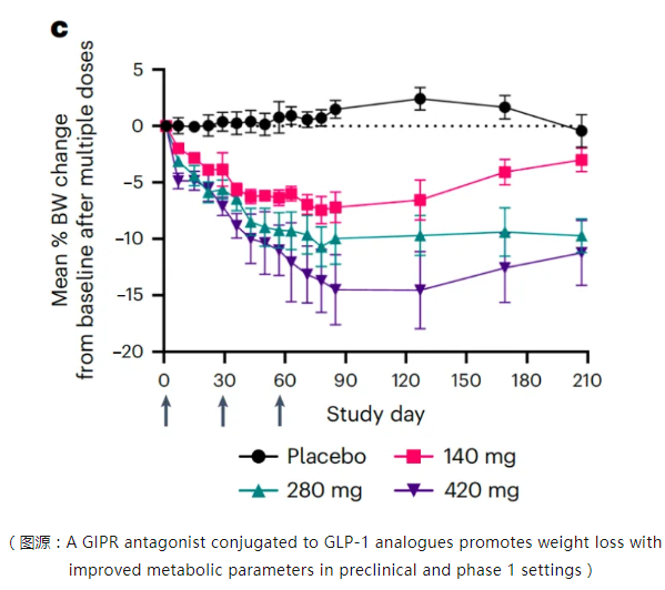 AMG133的减重适应症一期临床方面,具体数据已经在文章《创新药二哥的榜样:最强减肥药破局者》中有了较为细致的解读:接受剂量为420 mg的AMG 133治疗的患者在大约12周时体重与基线相比,平均降低14.5%。不过该研究单组患者是最少的,单组人数为6,造成的个体间差异或许较大。