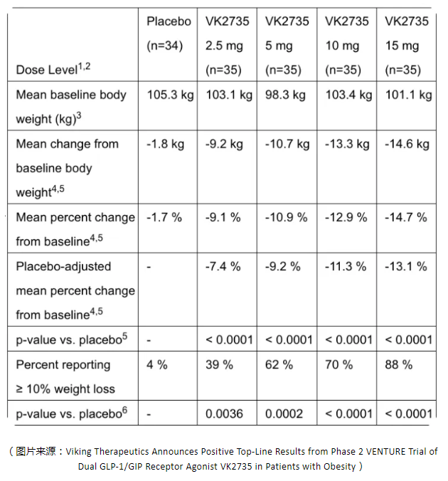 VK2735的口服版本则或许还太早期,临床I期试验时间仅为4周。其临床I期数据在今年3月份公布,剂量最高的40mg剂量组中,20mg一周给药一次后,40mg给药三次,体重变化为5.3%。这当然对一个月长度的效果来说很惊艳,目前口服版本的临床II期也在持续推进。